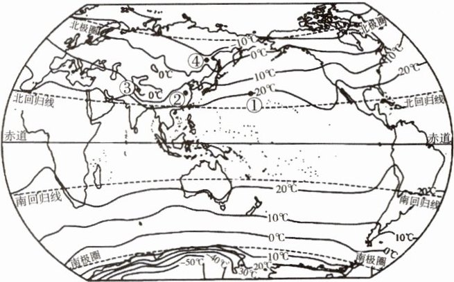 下图示意世界年平均气温分布图。读图,回答15~16题。