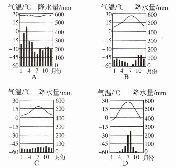 (2)A、B、C、D 四地中,气温年较差最大的是______地;年降水量最多的是______地。