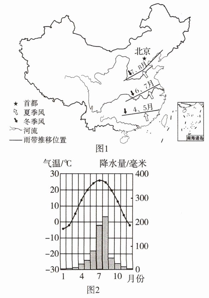 每年我国东部雨带有规律地南北移动。雨带一般于4月在华南登陆,随夏季风增强逐级北移(如图1所示),9月迅速南撤,10月退出大陆。图2是北京市气候资料图。读图,回答6~8题。