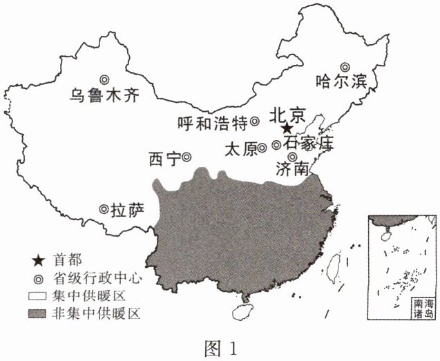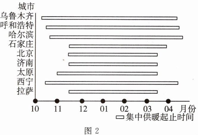 (2024·河南中考)集中供暖是我国冬季供暖的主要形式之一。图1、图2分别为中国集中供暖区分布示意图和部分城市集中供暖起止时间。读图,回答3~5题。