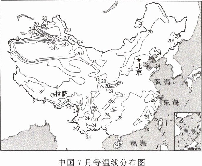 读中国7月等温线分布图,回答1~2题。