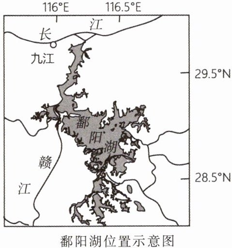 (2024·四川广安中考)宋代诗人余靖用“霁湖光万里,平波色连天”来描写鄱阳湖夏季的壮美景色。每年11月到次年3月,大批候鸟从北方来到鄱阳湖越冬,立春后它们又向北迁徙,返回北方繁殖地繁衍生息。读鄱阳湖位置示意图,回答7~8题。