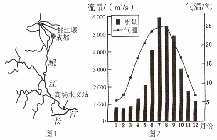(2024·湖南中考)都江堰坐落于成都平原西部的岷江上。成都因都江堰而旱涝保收,被誉为“天府之国”。图1、图2分别示意高场水文站的位置及其流量、气温统计资料。读图,回答4~6题。