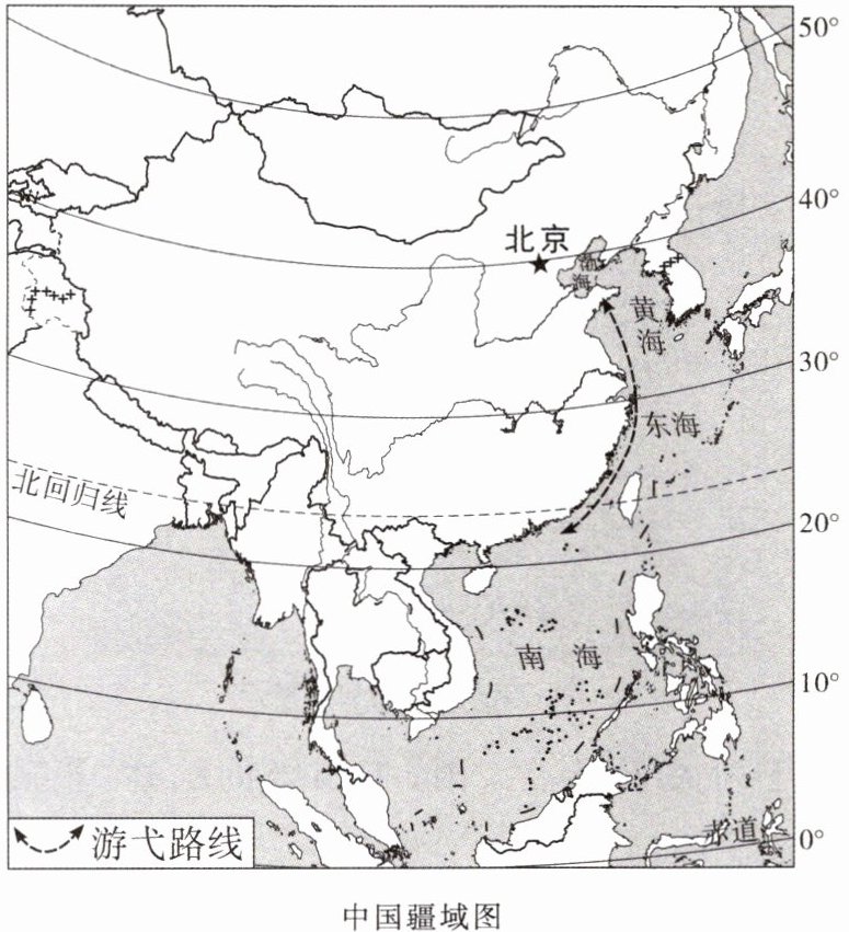 (2023·临沂中考)2022 年 5 月 20 日,全球最大的智慧养殖工船“国信 1 号”在青岛交付运营。该船以“船载舱养”模式常年游弋在黄海、东海和南海之间,利用深远海优质海水,养殖大黄鱼、石斑鱼、大西洋鲑鱼等鱼种,被称为“移动的海洋牧场”。下图为中国疆域图。读图,回答 8~9 题。