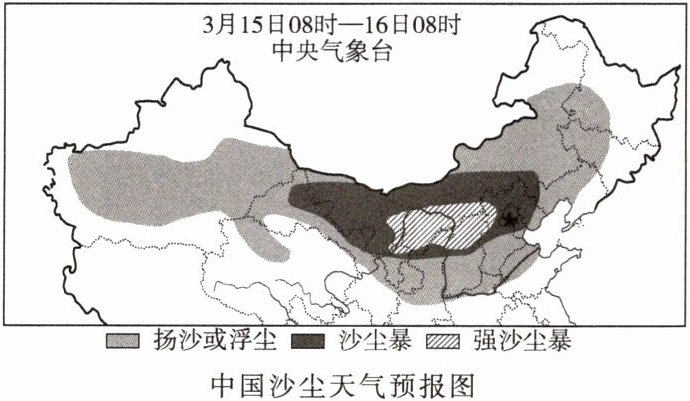 某年 3 月 15 日 8 时到 16 日 8 时,我国北方遭遇近 10 年来强度最强、范围最广的一次沙尘天气过程。读中国沙尘天气预报图,回答 1~3 题。