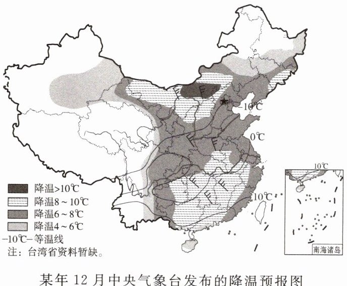 下图为某年 12 月中央气象台发布的降温预报图。读图,回答 6~7 题。