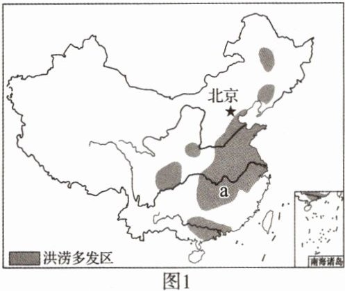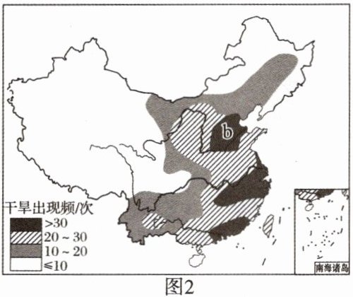 特殊的自然地理环境和季风气候条件使得我国成为世界上旱涝灾害最为频繁和严重的国家之一。图 1 为中国洪涝灾害分布图,图 2 为中国干旱灾害发生频次分布图。读图,回答 13~14 题。