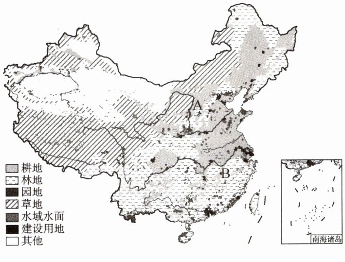 15. 下图为中国主要土地利用类型分布图。读图,回答下列问题。