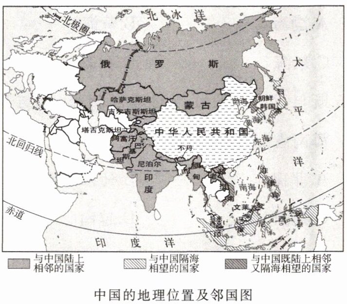 11. 读中国的地理位置及邻国图,探究我国地理位置特征及优越性。