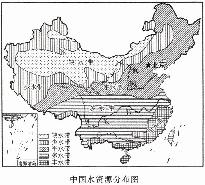 11. 要把实施南水北调工程同提高北方地区节水意识紧密结合起来,以水定域、以水定业,注意节约用水,不能一边加大调水,一边随意浪费水。下图为中国水资源分布图。读图,回答下列问题。