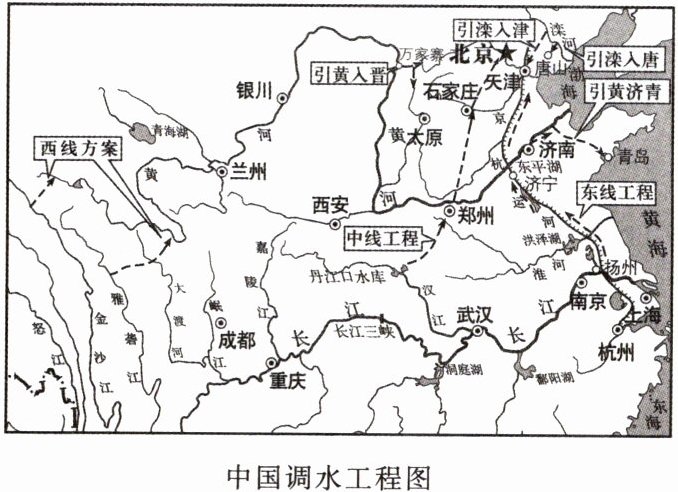 12. 下图为中国调水工程图。读图,回答下列问题。