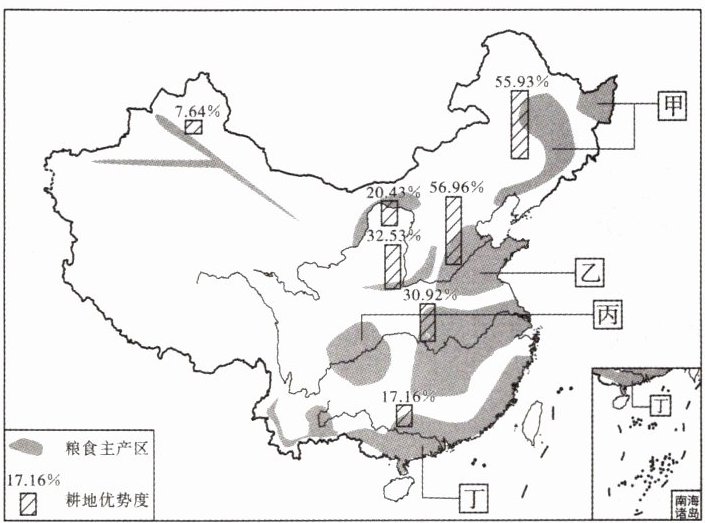 12.丁产区中,珠江三角洲耕地优势度低的主要原因是 (