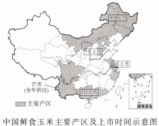 (2024·河南中考)鲜食玉米是人们餐桌上的新宠。云南省芒市的鲜食玉米因可全年供应,受到国内市场青睐。下图为中国鲜食玉米主要产区及上市时间示意图。读图,回答8~9题。