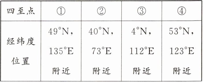 下表为中国领土四至点的经纬度位置。据此回答 8~9 题。