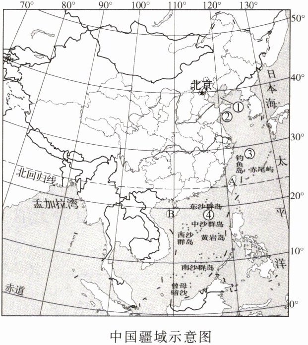 平方千米。图中①②③④是我国濒临的海洋,属于我国内海的是①渤海