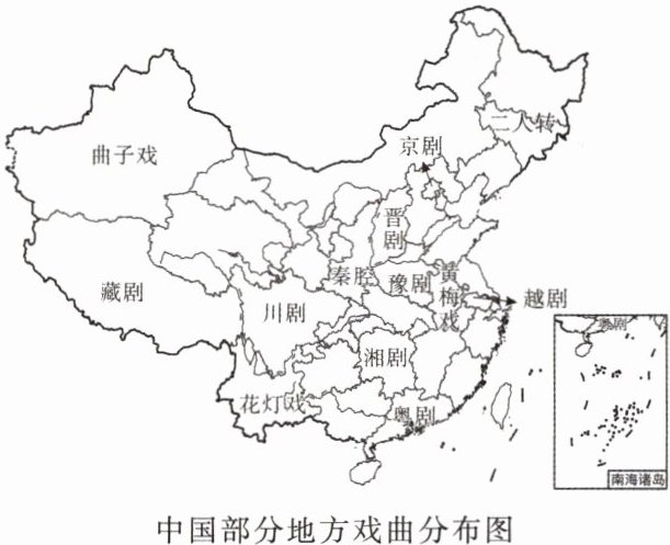 (2024·新疆中考)“小舞台,大智慧”,中国戏曲源远流长,种类繁多,百花齐放。读中国部分地方戏曲分布图,回答8~9题。