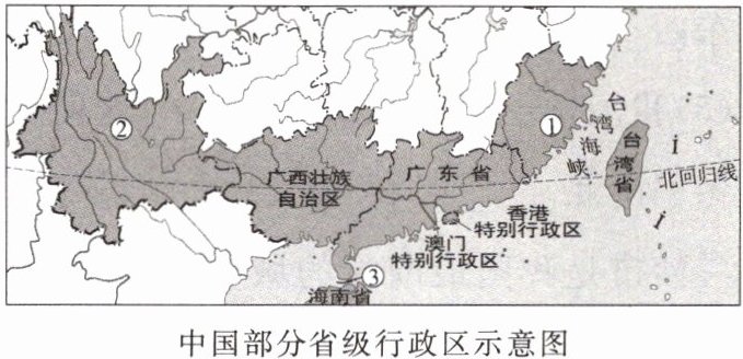 下图为中国部分省级行政区示意图。读图,回答1~3题。