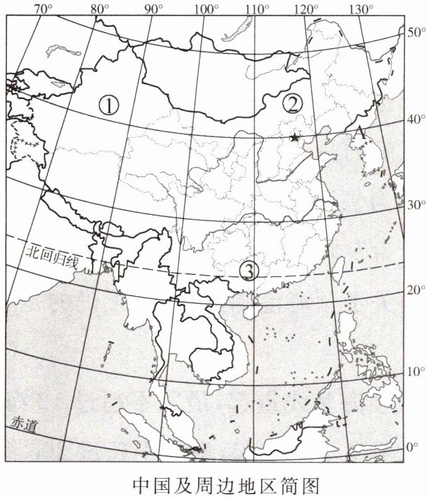 19. 下图是中国及周边地区简图。读图,回答下列问题。