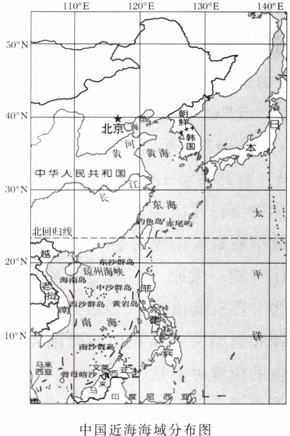 海洋国土是国土的重要组成部分。读中国近海海域分布图,回答 5~8 题。
