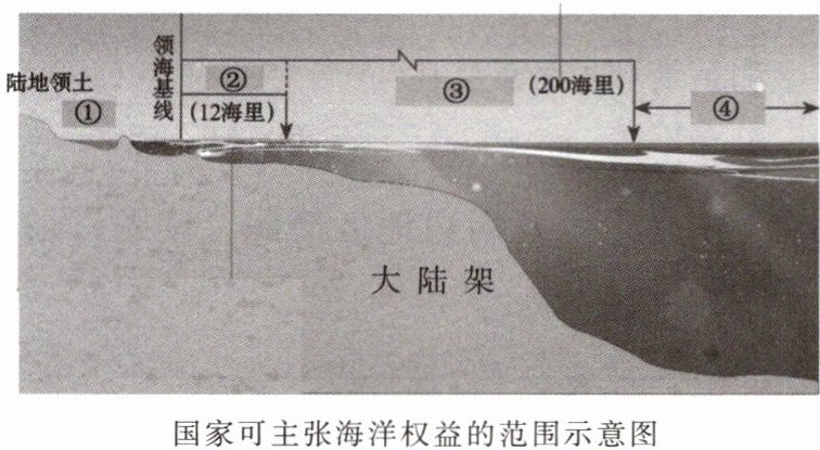 读国家可主张海洋权益的范围示意图,回答 1~4 题。