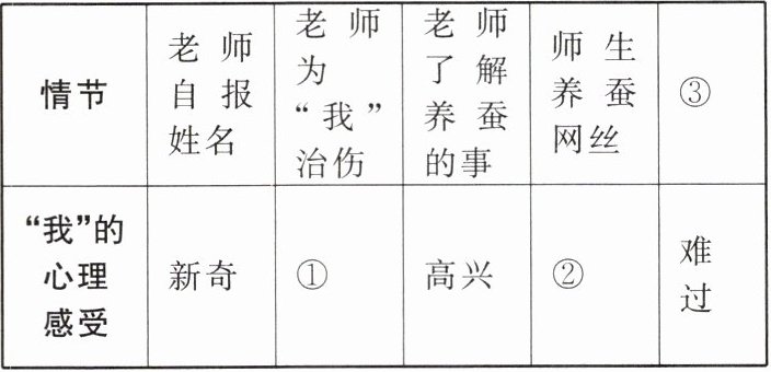 |情节|老师自报姓名|老师为“我”治伤|老师了解养蚕的事|师生养蚕网丝|③|