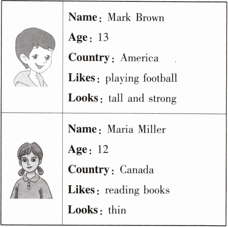 4.C 由表格第三栏中 “Likes: playing football”,可知马克(Mark)的爱好是踢足球。