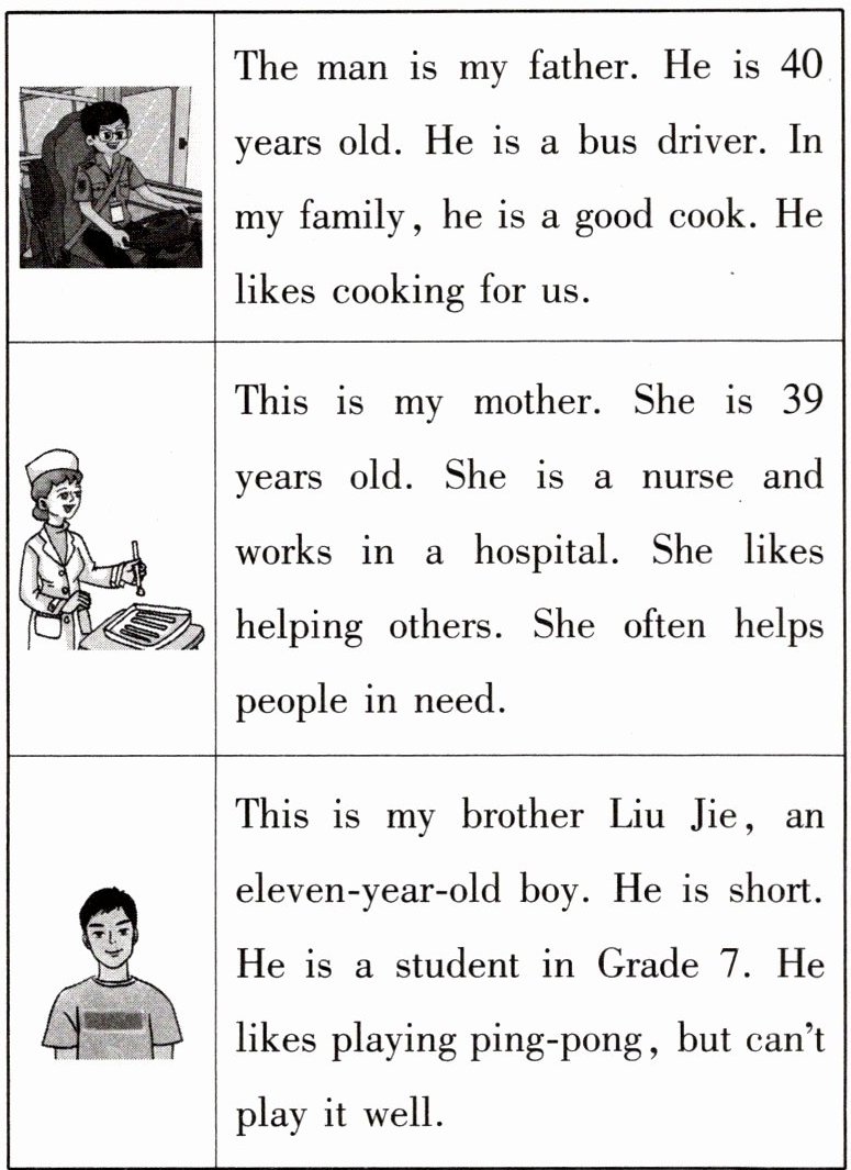 16. B 由第一段文字可知,作者一家有四口人:刘颖自己、她的爸爸、妈妈和哥哥。17. C 由表格的第一栏第四句可知,刘颖的爸爸擅长做饭。故选C。18. D 由表格的第二栏第三句可知,刘颖的妈妈是一名护士。19. B 由表格的第二栏最后两句可知,刘颖的妈妈总是帮助有需要的人,故可推断妈妈是个善良的人。20. A 由表格的第三栏第一句可知,刘杰11岁。