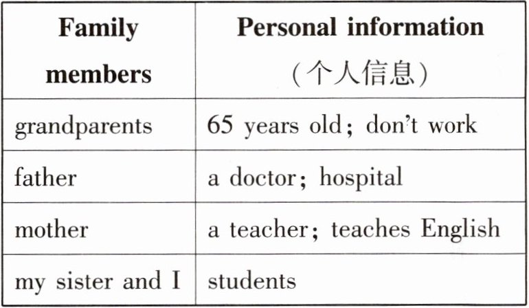 假如你是李峰,你们班下周一的英语口语课的内容为介绍自己的家人。请你根据表格内容,用英语写一篇短文介绍你的家人。