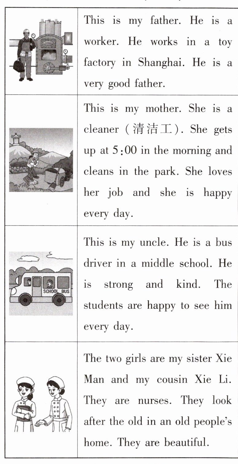 16. D 由表格的第一栏第二句可知,谢菲的父亲是一名工人。 17. A 由表格的第三栏第二句可知,谢菲的叔叔是一名校车司机,在学校工作。 18. C 由表格的第四栏第一句可知,谢丽是谢菲的堂姐妹。 19. A 由表格的第一栏第三句可知,①是正确的;由表格的第二栏最后一句可知,②是正确的;由表格的第三栏第三句可知,③是正确的;由表格的第四栏第二句可知,谢菲的姐姐是护士,故④的描述是错误的。 20. B 这些材料主要介绍了谢菲家庭成员的工作。