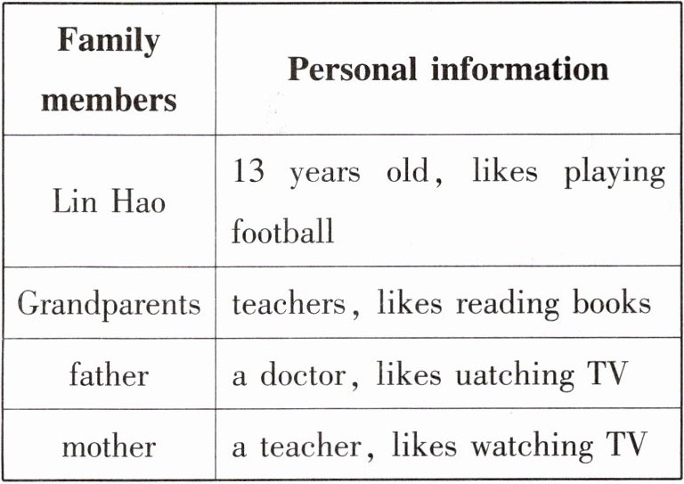 My Family My name is Lin Hao. I'm thirteen years old. I am a middle school student. I like playing football very much. There are five people in my family. My grandparents are teachers. They like reading books very much. My father is a doctor, and my mother is a teacher. They like watching TV. This is my family. I love my family very much.
