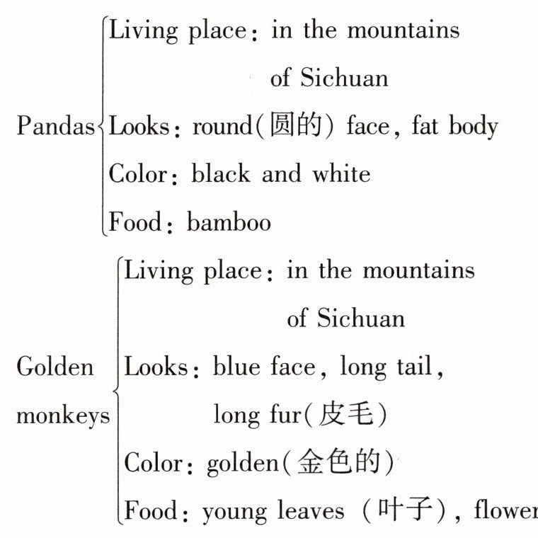 请你根据下面的思维导图,用英语写一篇关于熊猫和金丝猴对比的短文,分享给大家。