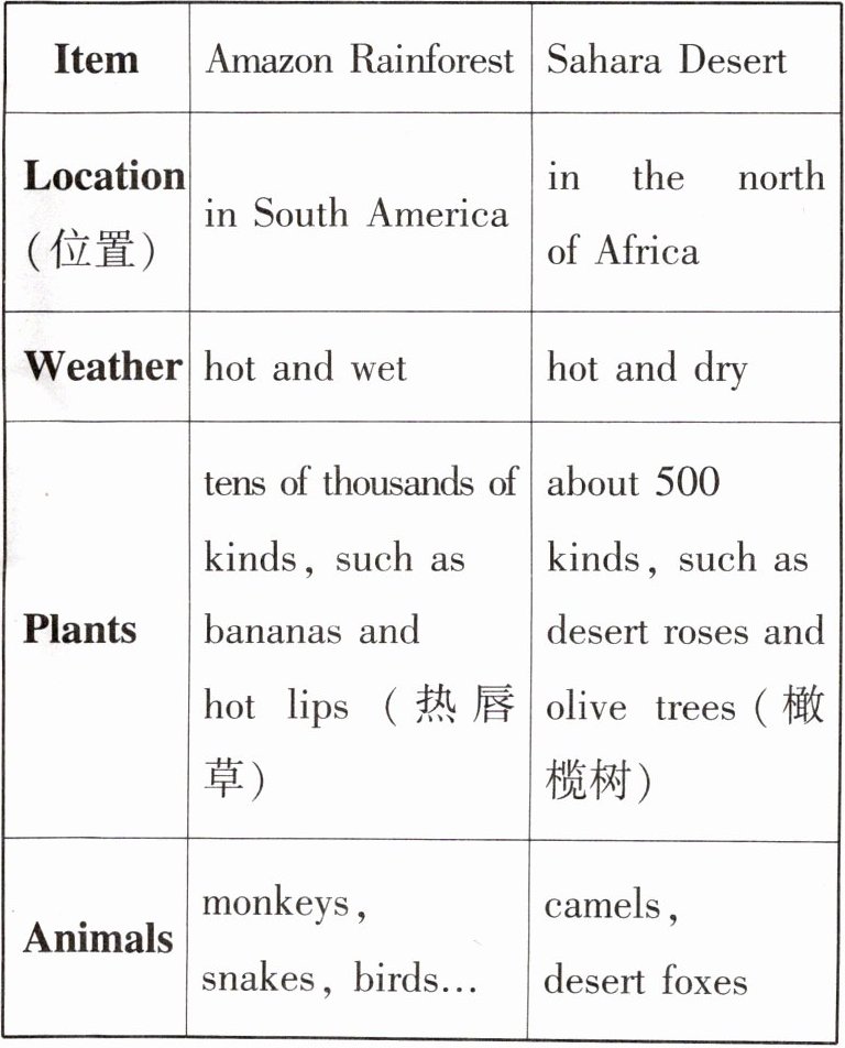 英语课上,老师让学生们把收集到的关于亚马孙雨林和撒哈拉沙漠的资料进行讨论整理。请你根据他们搜集的资料,用英语写一篇介绍亚马孙雨林或撒哈拉沙漠的短文,分享给同学们。