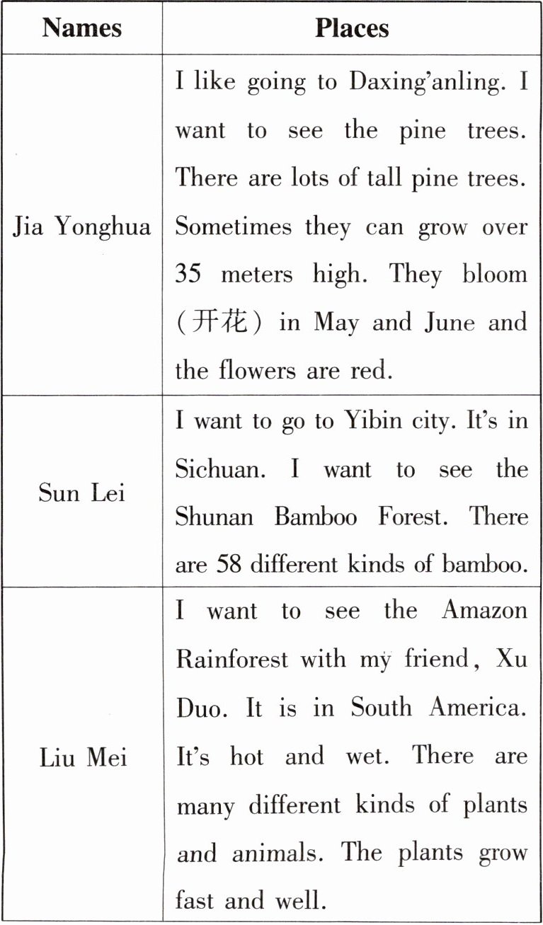21. A 由表格的第一栏最后一句可知,松树的花是红色的。22. B 由表格的第二栏第一句可知,孙雷想去宜宾市。23. B 由表格的第二栏最后一句可知,蜀南竹海有 58 种竹子。24. D 由表格的第三栏第一句可知,刘梅和徐朵是朋友。25. C 由表格的第三栏第三句可知,亚马孙雨林气候炎热且潮湿。