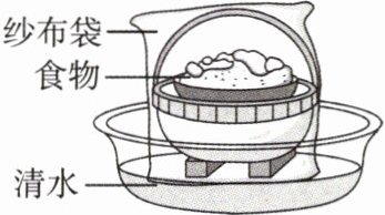 5. 如图所示是自制的“简易冰箱”,在盛水的盆里放两块高出水面的砖,砖上放一只比盆小一点的篮子,篮子里装有剩饭剩菜,再将纱布袋罩在篮子上,并使袋口的边缘浸入水里,吸收盆里的水,从而使整个纱布袋湿润。篮子上罩纱布袋是通过