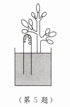 5. 盆栽养护应遵循“土壤含水不浇水,土壤干时要浇水”的原则。春季,小明自制“土壤含水显示仪”,探测花盆内土壤是否含液态水。如图所示,中午将试管倒插入土壤深处,傍晚发现试管内上端出现水珠,说明土壤含液态水。从土壤含液态水到试管内出现水珠,发生的物态变化是(