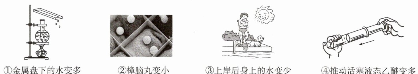C 【点拨】①金属盘下的水变多是水蒸气的液化现象,液化放热;②樟脑丸变小,是升华现象,升华吸热;③游泳上岸后身上的水变少,是水的蒸发现象,蒸发吸热;④推动活塞液态乙醚变多,是液化现象,液化放热;综上所述,吸热的有②③。