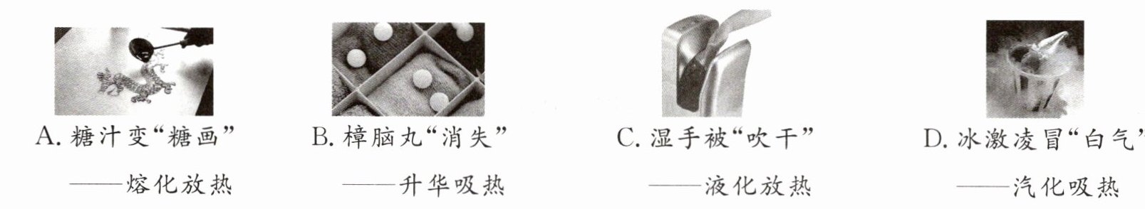 B 【点拨】物质由固态变为液态的过程叫熔化,熔化吸热;物质由固态直接变成气态的过程叫升华,升华吸热。即防热材料在熔化、升华过程中都吸热。