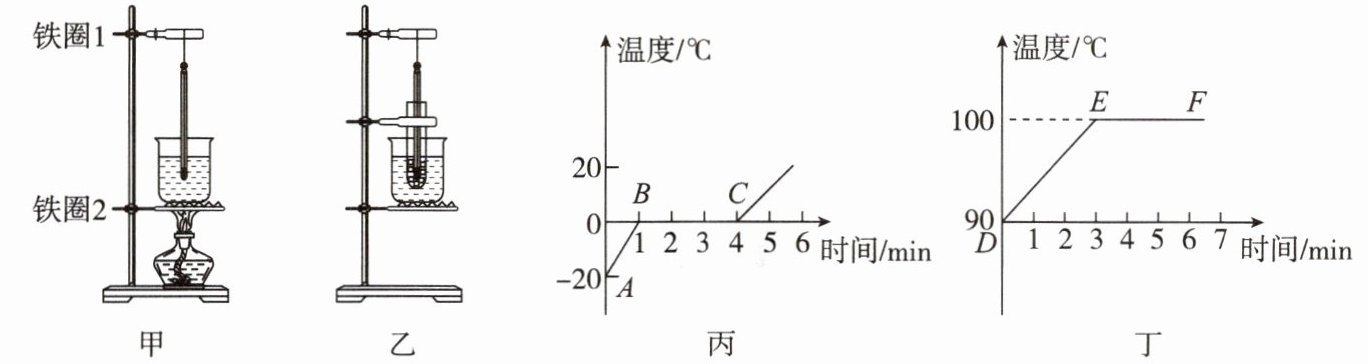 9. 图甲、乙分别是“探究水在沸腾前后温度变化的特点”和“探究冰的熔化特点”的实验装置,小荣将这两个实验进行对比研究,图丙、丁是实验后画出的图像。