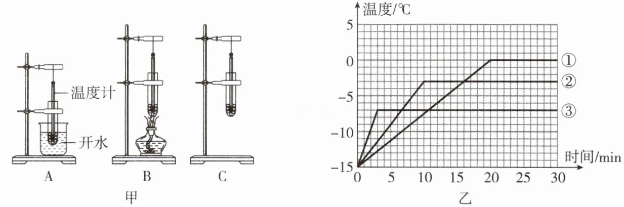 (填“A”“B”或“C”)。[分析] 在相同条件下测量三者的温度变化,得到三条温度变化图线(纯冰对应图线①、淡盐冰对应图线②、浓盐冰对应图线③)。由图乙可知:浓盐冰的熔点是