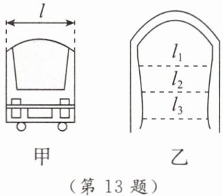 13. 如图甲所示,西班牙制造的新式列车车厢的宽度$l = 3.500\ m$。为判断新式列车车厢能否通过一处老式隧道,技术人员分别测量了隧道内部三处的宽度,如图乙所示,测量结果为$l_1 = 3.600\ m$、$l_2 = 3.480\ m$、$l_3 = 3.540\ m$。技术人员使用的刻度尺分度值为