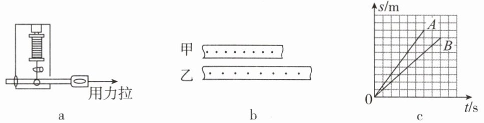 9. 打点计时器是一种记录物体在一定时间间隔内运动轨迹的仪器,目前实验室用的打点计时器每隔0.02 s打一个点。如图a所示,小明用打点计时器探究直线运动的规律,小车一端固定一条纸带,纸带穿过打点计时器,用力拉动小车的另一端沿水平方向运动。先后打出了如图b所示甲、乙两条纸带,然后画出了相应的s-t图像,如图c所示。则下列判断正确的是(