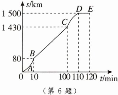 $ m/s $。飞机飞行过程中经历起飞加速、定速巡航、减速降落等过程,如图所示是飞机飞行过程的 $ s - t $ 图像。 $ BC $ 段为定速巡航匀速飞行阶段,速度为250