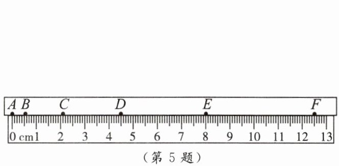 5. 如图所示是一小球从 $ A $ 点沿直线运动到 $ F $ 点的频闪照片。若频闪照相机每隔 $ 0.2 \, s $ 闪拍一次,分析照片可知:小球从 $ A $ 点到 $ F $ 点是做