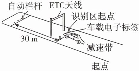 11. (新趋势 真实情境)为提高通行效率,许多高速公路出入口安装了电子不停车收费系统 ($ ETC $)。如图所示,一辆小轿车以 $ 10 \, m/s $ 的速度匀速驶过 $ ETC $ 通道前的减速带,$ 4 \, s $ 后到达识别区起点。并在识别区起点听到车载电子标签提示音后,减速通过识别区起点到自动栏杆之间的距离,该距离为 $ 30 \, m $(图中标出),所用时间为 $ 5 \, s $。求: