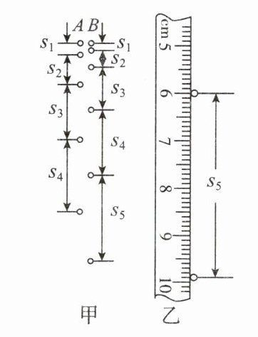 (2) 用刻度尺分别测得照片上 $ A $、$ B $ 两球相邻位置之间的各段距离,$ A $、$ B $ 两球相对应的 $ s_1 $、$ s_2 $、$ s_3 $、$ s_4 $ 的测量结果如上表所示。测量照片上 $ B $ 球相邻位置之间的距离 $ s_5 $ 时,刻度尺的示数如图乙所示,则 $ s_5 = $______ $ mm $。设 $ A $ 球在空中下落时,通过 $ s_2 $、$ s_3 $ 的过程中的平均速度分别为 $ v_2 $、$ v_3 $,则 $ v_2 : v_3 = $______。
