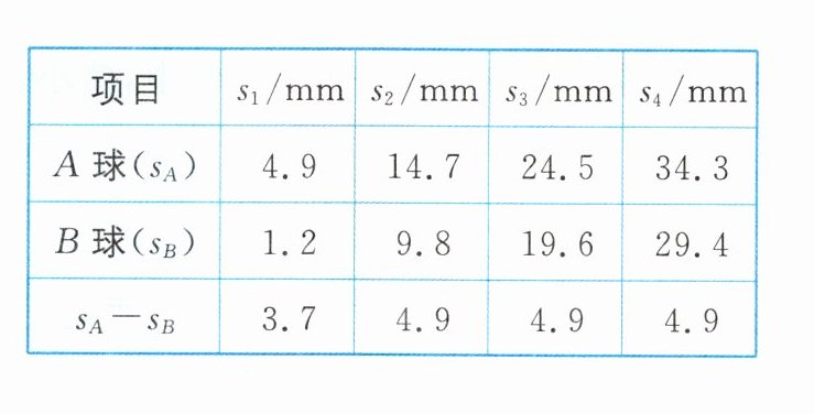(填“$ A $”或“$ B $”)球。(2) 用刻度尺分别测得照片上 $ A $、$ B $ 两球相邻位置之间的各段距离,$ A $、$ B $ 两球相对应的 $ s_1 $、$ s_2 $、$ s_3 $、$ s_4 $ 的测量结果如上表所示。测量照片上 $ B $ 球相邻位置之间的距离 $ s_5 $ 时,刻度尺的示数如图乙所示,则 $ s_5 = $