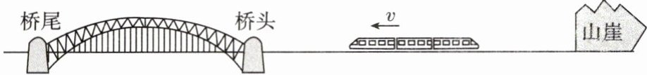 4. 如图所示,长度为150 m的火车在笔直的轨道上匀速行驶,在从山崖驶向大桥的过程中,火车头距离桥头200 m时鸣笛,鸣笛5 s后,火车头到达桥头,此时车头的司机听到来自山崖的回声;听到回声30 s后,车尾驶过桥尾。求:(声音在空气中的传播速度为340 m/s)