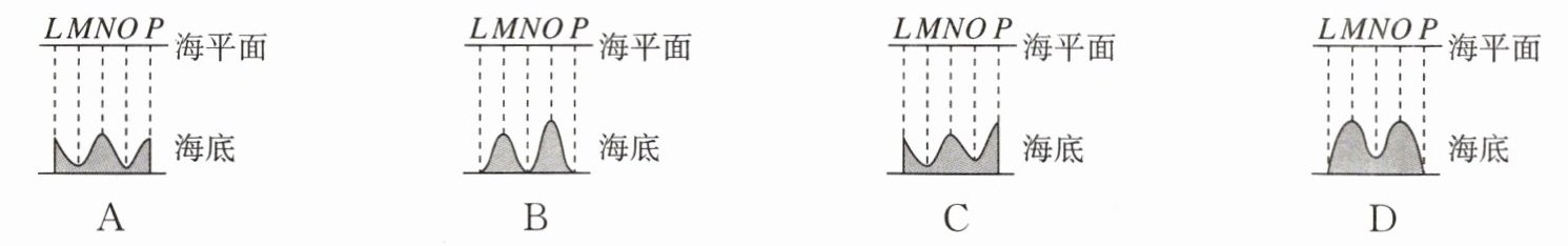 10. 一艘科考船行驶在某海域,利用声呐系统对该海域的海底形状进行了测绘。具体方法是:在经过该海域海平面等间距的L、M、N、O、P五个位置时,向正下方海底定向发射超声波,测得回声信号的时间分别为0.20s、0.30s、0.20s、0.30s、0.20s。由此判断,该海域海底的大致形状为(