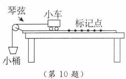 10. (新考法 小制作)小明利用一根琴弦和一些简单器材制作了如图所示的“单弦琴”,小车静止在某位置,拨动箭头处琴弦的同时,向小桶里增加沙子,能