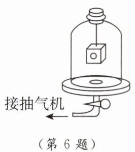 6. [2024·苏州工业园区期中] 如图所示,为了验证“声音在真空中不能传播”,小明用细线把正在发声的音乐盒吊在玻璃罩中,用抽气机抽出玻璃罩内的空气。若抽气机抽尽空气,玻璃罩内是真空时,从罩外